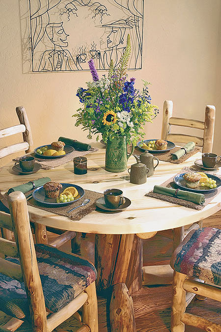 For those leisurely weekend breakfasts, try our cozy round log table and chairs. The tabletop is solid wood, secured to a stout stump base (a leg base is an option on all of our tables).